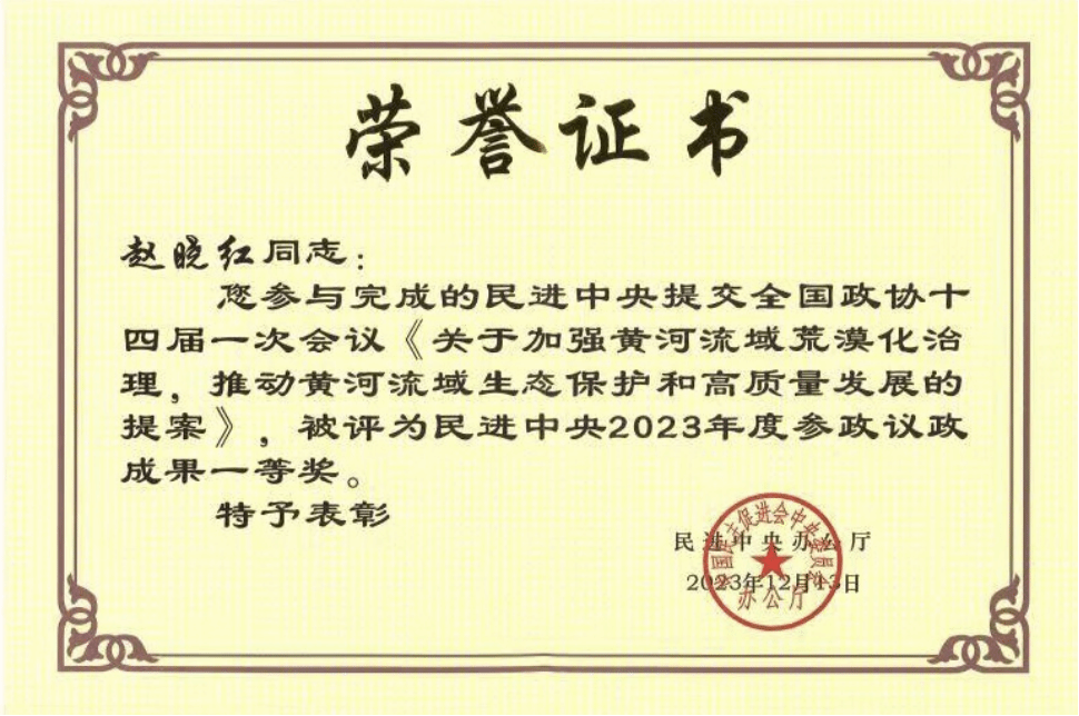 民进陕西省委会委员、环球ug登录网站民进主委赵晓红教授参与完成的民进中央提交全国政协十四届一次会议《关于加强黄河流域荒漠化治理,推动黄河流域生态保护和高质量发展的提案》,获民进中央2023年度参政议政成果一等奖。民进环球ug登录网站支部获民进陕西省委会“参政议政工作先进集体”。