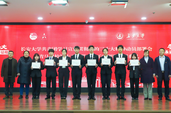 与会领导嘉宾为第十四期学生骨干培训班结业学员代表和优秀学员颁发结业证书和荣誉证书并和2022年经典诵读会获奖团队代表合影留念。“青马工程”学员带来的歌曲《有我》和朗诵《今天,我站在这里》使人深受感动和教育。