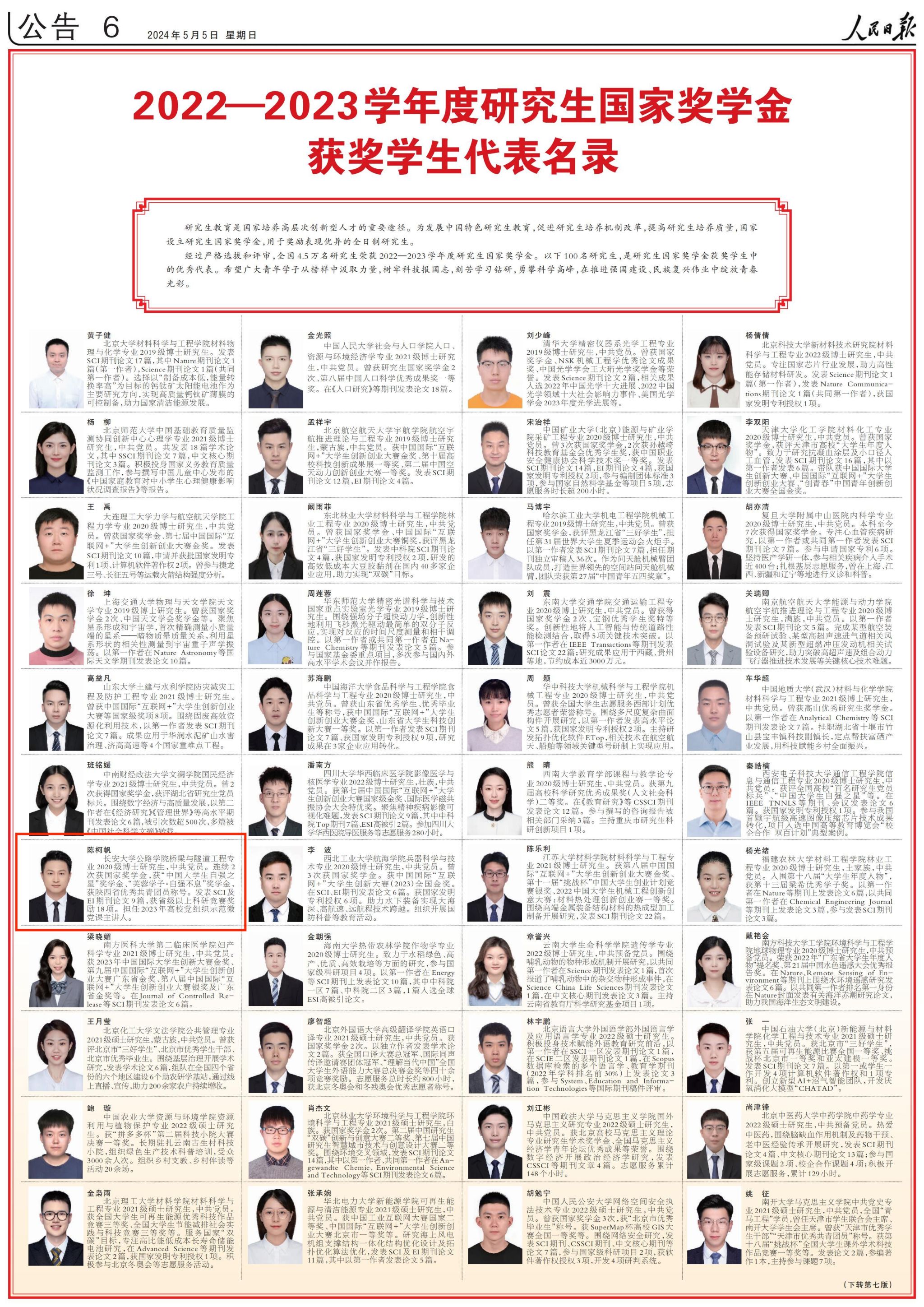 近日,《人民日报》专版刊登《2022—2023学年度本专科生国家奖学金获奖学生代表名录》《2022—2023学年度研究生国家奖学金获奖学生代表名录》,环球ug登录网站汽车学院物流工程专业2020级本科生黎敏琦、公路学院桥梁与隧道工程专业2020级博士研究生陈柯帆入选名录,这是环球ug登录网站本科生近五年连续荣登《人民日报》本专科生国家奖学金获奖学生代表名录,研究生连续两年入选研究生国家奖学金获奖学生代表名录。
