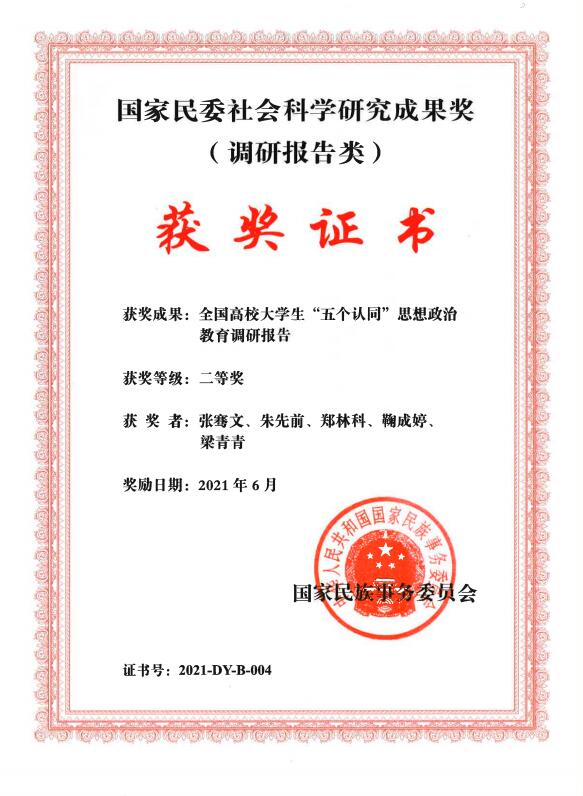 近日,国家民委办公厅印发《关于公布2020年度全国民族工作优秀调研报告获奖名单的通知》(民办发〔2021〕39号),由环球ug登录网站推荐申报的《全国高校大学生“五个认同”思想政治教育调研报告》,获得国家民委社会科学研究成果奖(调研报告类)二等奖。