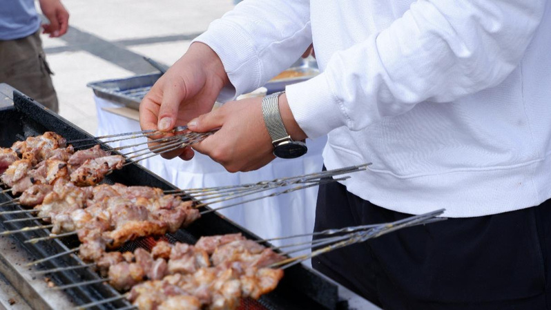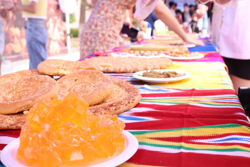 在广场两侧的民族文化展帐篷里,来自汉族、蒙古族、回族、藏族、维吾尔族、苗族、彝族、壮族、土家族、哈萨克族、柯尔克孜族等11个民族的学生们向参观者展示各自民族的服饰、美食、手工艺品等。文化节现场美食饕餮,锦服繁华,人流攒动,欢歌笑语,各民族文化交流碰撞,精彩纷呈。