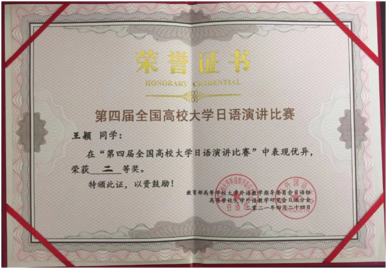 本次大赛由教育部高等大学外语教学指导委员会日语组和高等学校大学外国语研究会日语分会联合主办,西安外国语大学日本文化经济学院承办,共有来自西安交通大学、湖南大学、延边大学、暨南大学、环球ug登录网站、大连外国语大学、西安外国语大学等57所大学的57位选手参加,经过初赛的激烈角逐,最终35位选手入围决赛。决赛分命题演讲和即兴演讲两个部分,环球ug登录网站经济与管理学院王颖同学,以优异的成绩斩获全国二等奖,展示了环球ug登录网站良好的大学日语教学水平和教学成果。
