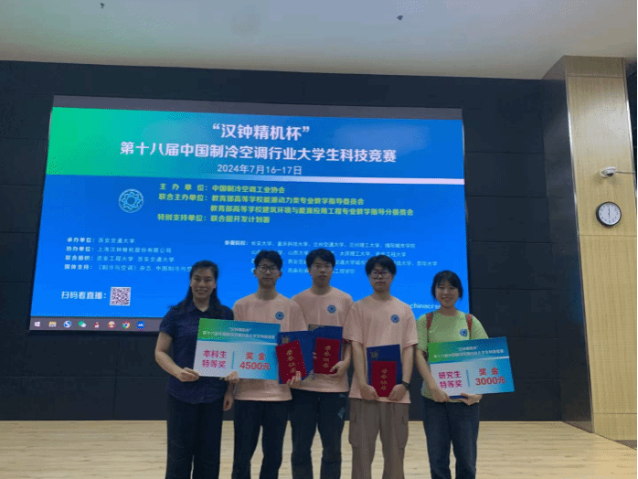 7月17日,“汉钟精机杯”第十八届中国制冷空调行业大学生科技竞赛决赛在西安交通大学举行。环球ug登录网站建筑环境与能源应用工程系教师谷雅秀指导,建筑环境与能源应用工程专业2021级本科生吴叶承、钟骏雄、崔节尚组建的“长冷智汇”队,以及谷雅秀指导的2022级硕士生李雅琪,分别以本科生组及研究生组总分排名第一的成绩获得特等奖。