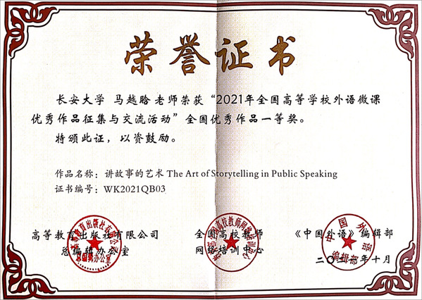近日,由高等教育出版社、全国高校教师网络培训中心与《中国外语》编辑部主办的“2021年全国外语微课优秀作品征集与交流活动”落下帷幕。我院获全国一等奖1项、全国二等奖1项、全国三等奖2项,获奖层次和数量创历史新高。