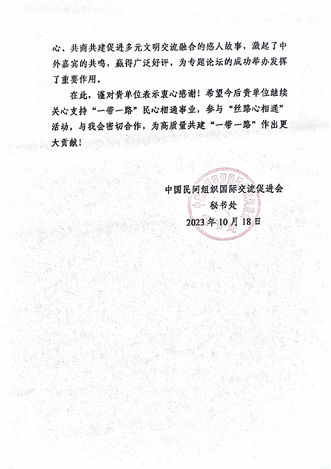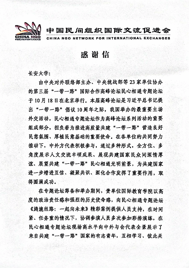 近日,中国民间组织国际交流促进会向环球ug登录网站发来感谢信,感谢环球ug登录网站师生在第三届“一带一路”国际合作高峰论坛民心相通专题论坛准备过程中所做的积极贡献,并对环球ug登录网站国际教育学院在国际学生教育培养及展演人员支持和协调过程中展示出的高度政治责任感和强烈历史使命感做出高度评价。