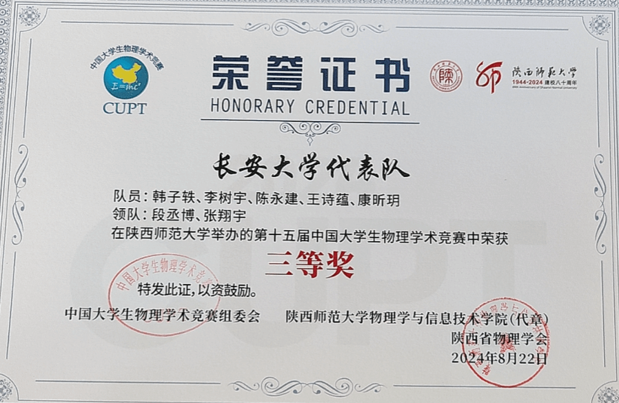 8月18至23日,第十五届中国大学生物理学术竞赛国赛在陕西师范大学举行,来自全国67所高校的68支队伍参加团队赛。环球ug登录网站韩子轶、李树宇、陈永建、康昕玥、王诗蕴等五位同学代表学校参加比赛,荣获团体三等奖。