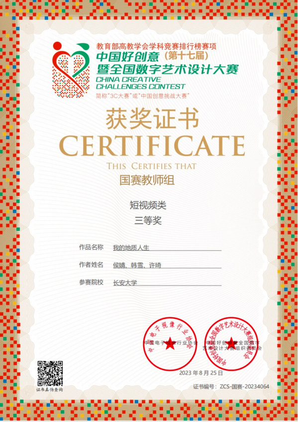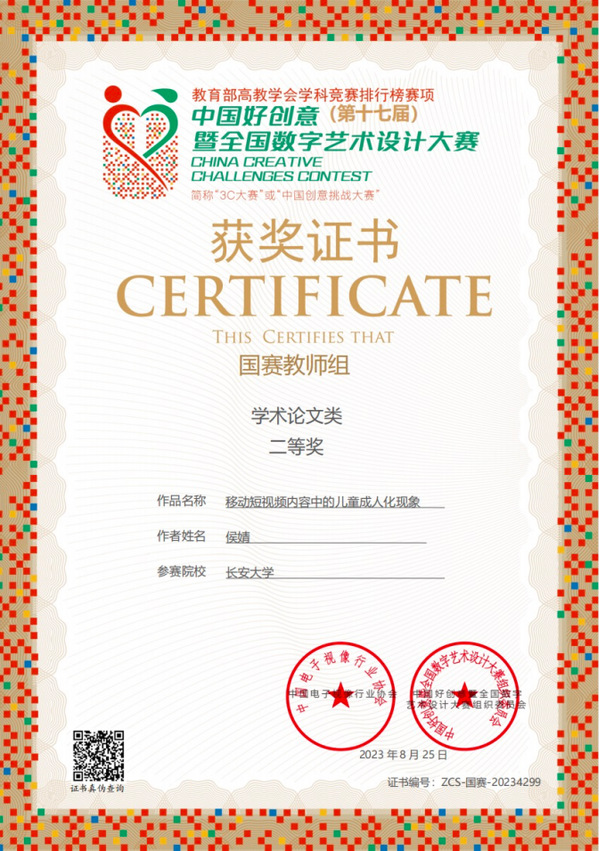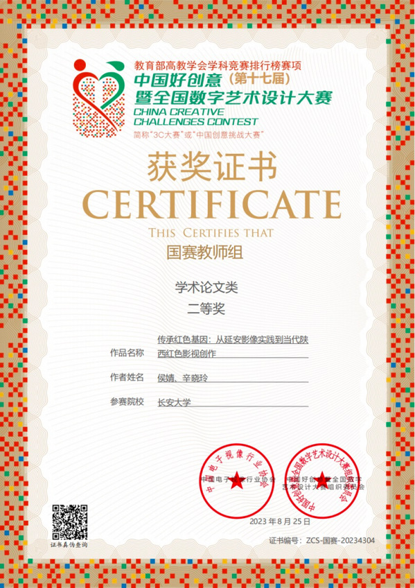 近日,第17届中国好创意暨全国数字艺术设计大赛落下帷幕,人文学院广播影视系教师侯婧撰写的论文《移动短视频内容中的儿童成人化现象》获教师组学术论文类国赛二等奖;侯婧、辛晓玲合作论文《传承红色基因:从延安影像实践到当代陕西红色影视创作》获教师组学术论文类国赛二等奖;侯婧、韩雪、许琦创作的纪录片《我的地质人生》获得短视频类国赛三等奖。这是环球ug登录网站教师首次在该赛事中荣获国家级奖项。