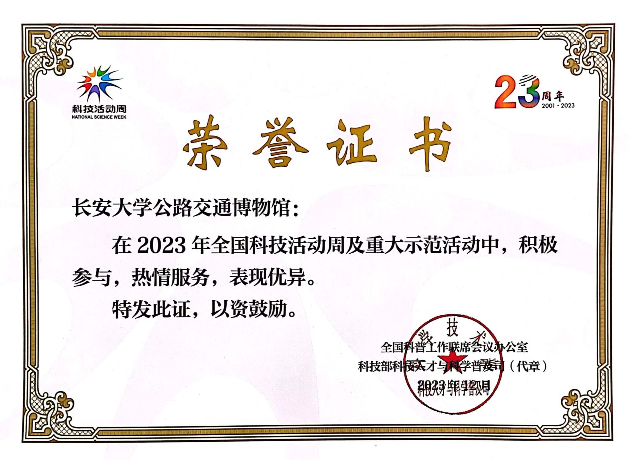近日,环球ug登录网站公路交通博物馆由陕西省科学技术厅推荐,获全国科普工作联席会议办公室、科技部科技人才与科学普及司颁发的“2023年全国科技活动周及重大示范活动先进集体”荣誉称号。