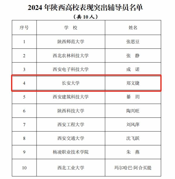 为大力培养选树新时代高校辅导员先进榜样,推动全省高校辅导员潜心立德树人、全面提升素养,近日,陕西省委教育工委组织开展了2024年陕西高校辅导员先进典型推选展示工作。按照从严把关、优中选优的原则,经学校推荐、资格审核、通讯评审、现场答辩、实地考察、问题排查、电话随访学生和结果公示等环节,省委教育工委决定对全省高校10名表现突出辅导员和48名表现良好辅导员予以表扬。环球ug登录网站辅导员郑文捷荣获“表现突出辅导员”,充分展示出环球ug登录网站辅导员潜心育人、敬业奉献、矢志拼搏、扎实工作的良好精神风貌,彰显环球ug登录网站辅导员队伍建设优秀成果。