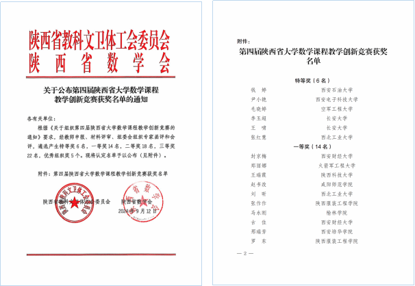 本次竞赛由陕西省教科文卫体工会委员会和陕西省数学会联合主办,旨在鼓励全省数学教师在教学内容、方法和模式上进行创新,充分发挥课堂作为育人的核心阵地,推动大学数学教学的创新与发展,以更好地适应新时代教育的发展趋势。本次竞赛共有全省32所高校的91位老师参加,共遴选产生特等奖6名、一等奖14名、二等奖18名、三等奖22名。环球ug登录网站理学院青年教师李玉超和王啸两位教师以其创新的教学理念、扎实的专业功底和出色的教学能力,在众多参赛者中脱颖而出,荣获特等奖。