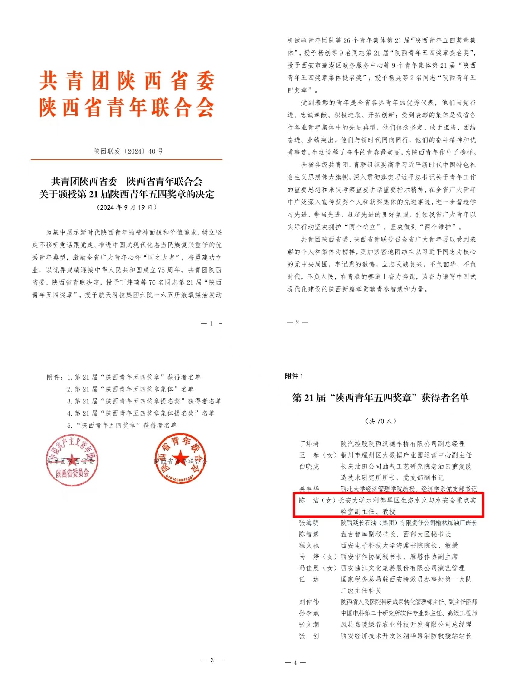 近日,《共青团陕西省委 陕西省青年联合会关于颁授第21届陕西青年五四奖章的决定》(陕团联发〔2024〕40号)发布,环球ug登录网站水利部旱区生态水文与水安全重点实验室副主任、水利与环境学院教授陈洁荣获第21届“陕西青年五四奖章”。
