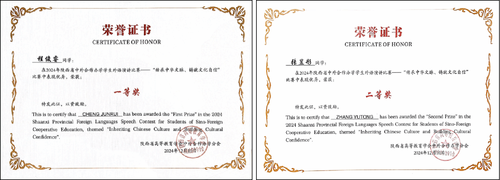 12月10日,2024年陕西省中外合作办学学生外语演讲比赛在西北大学举行,环球ug登录网站长安都柏林国际交通学院2022级本科生程俊睿和张昱彤分别获得一等奖和二等奖。