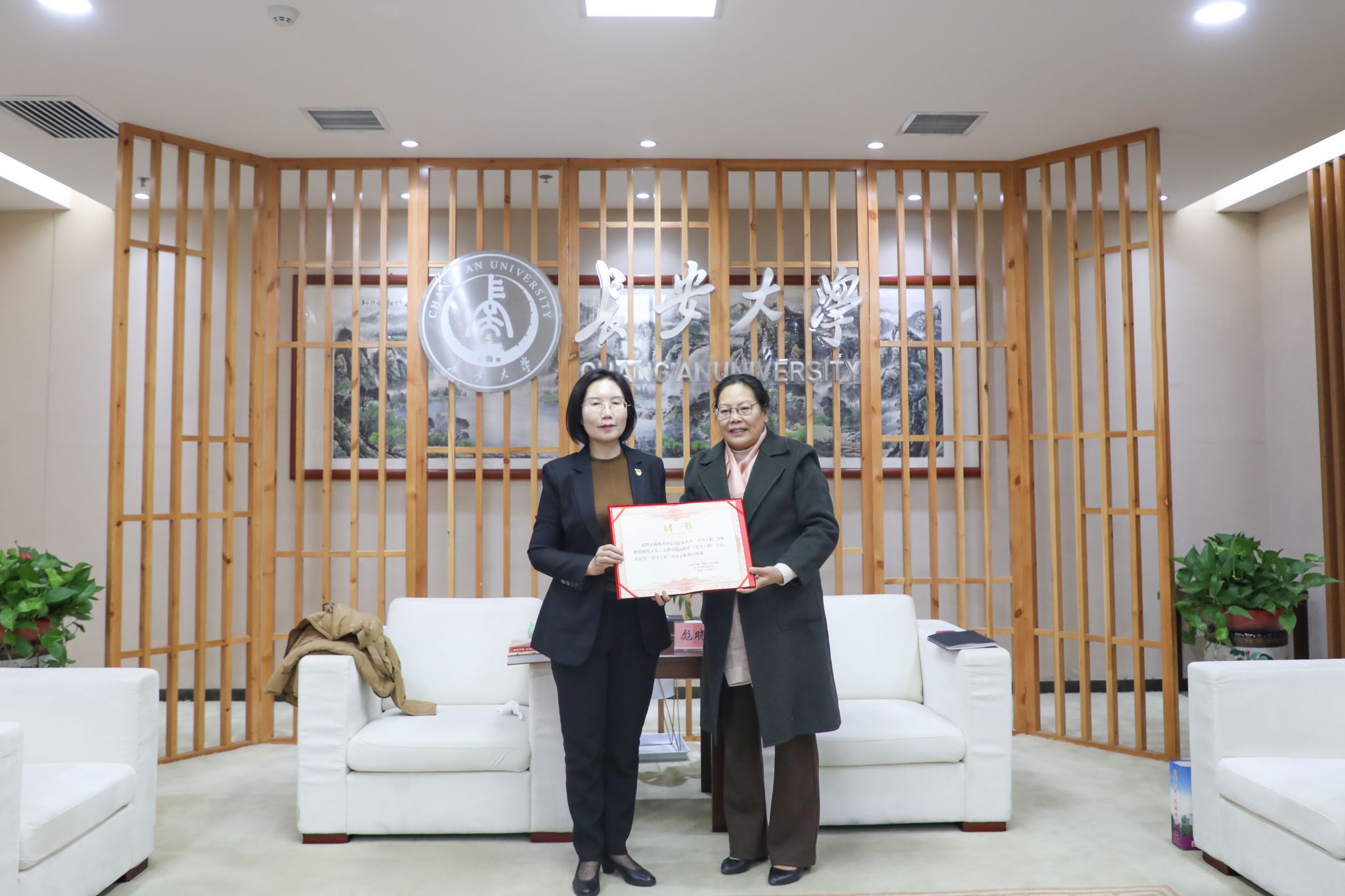 彪晓红对茆梅芳一行表示热烈欢迎。她从办学历史、学科特色以及近年来的人才培养等方面介绍了学校的各项工作,并为茆梅芳颁发环球ug登录网站“青马工程”导师聘书。