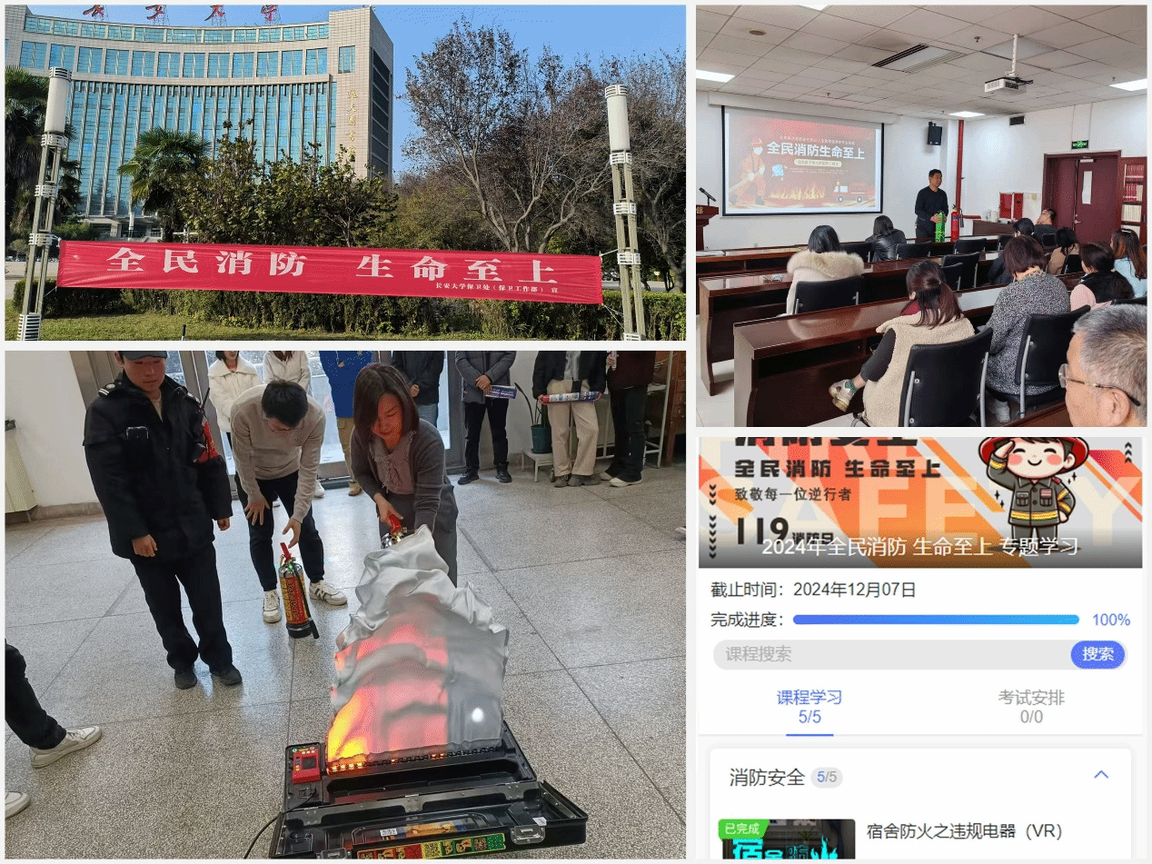 多措并举,线上线下同步开展宣传教育。自活动开展以来,线上通过“平安长大”微信公众号,结合校园消防工作特点,就消防器材使用、室内用电安全等知识进行了系列推送,并开展了线上专题学习课,有效普及了消防安全知识,营造了校园中人人关心消防、时时防范风险的良好氛围;线下利用横幅、海报等方式进行消防安全宣传,校内各二级单位积极开展消防安全现场培训,重点学习了消防法律规章、消防安全“一懂三会”以及消防安全隐患排查相关知识。