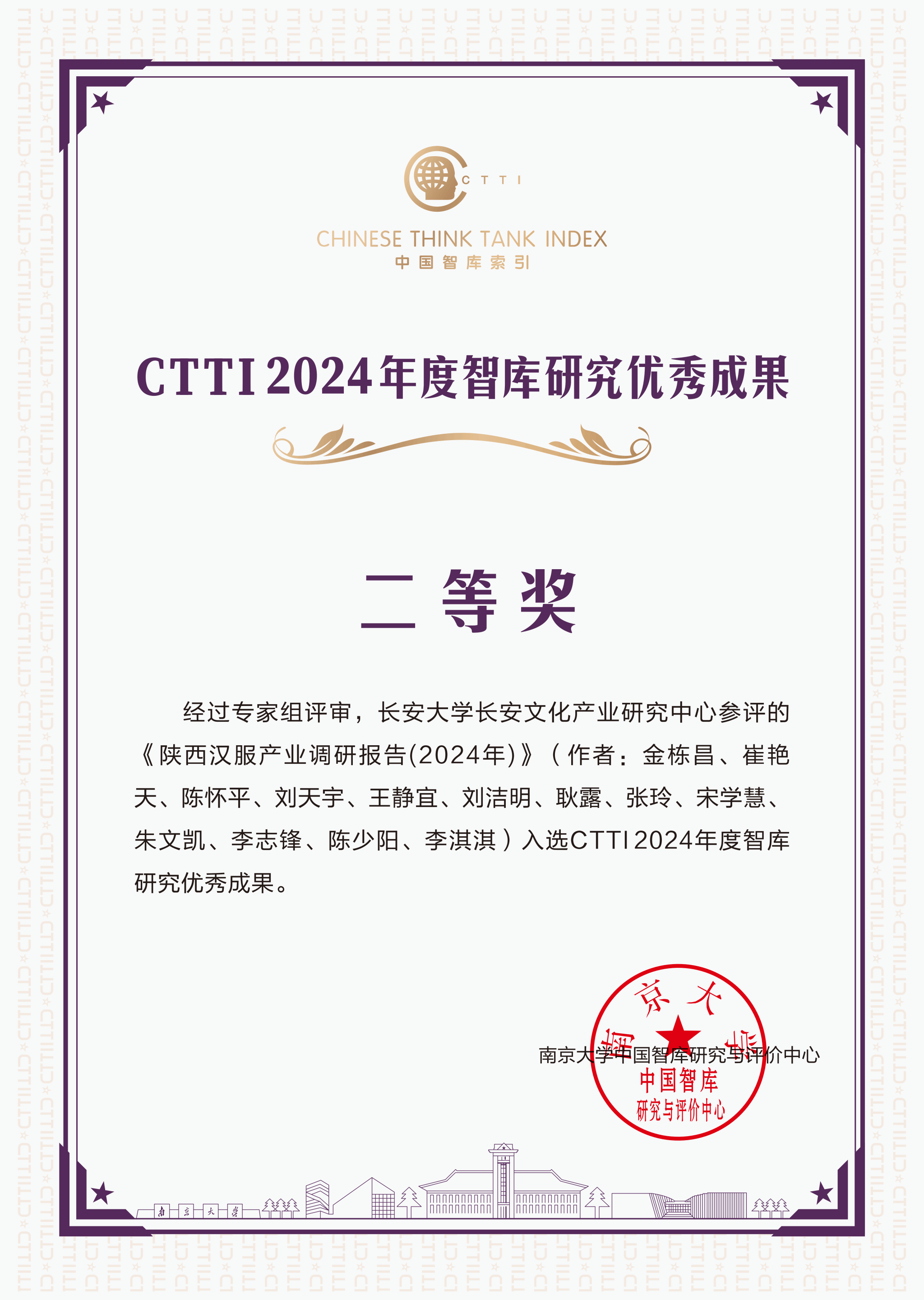 论坛发布了CTTI 2024年度智库建设最佳案例与智库研究优秀成果的征集推介结果、CTTI 2024年度增补来源智库名单。环球ug登录网站《陕西汉服产业调研报告(2024年)》荣获CTTI 2024年度智库研究优秀成果二等奖,综合运输发展研究中心、长安文化产业研究中心2家平台入选“中国智库索引”(CTTI)来源智库,实现历史性突破。