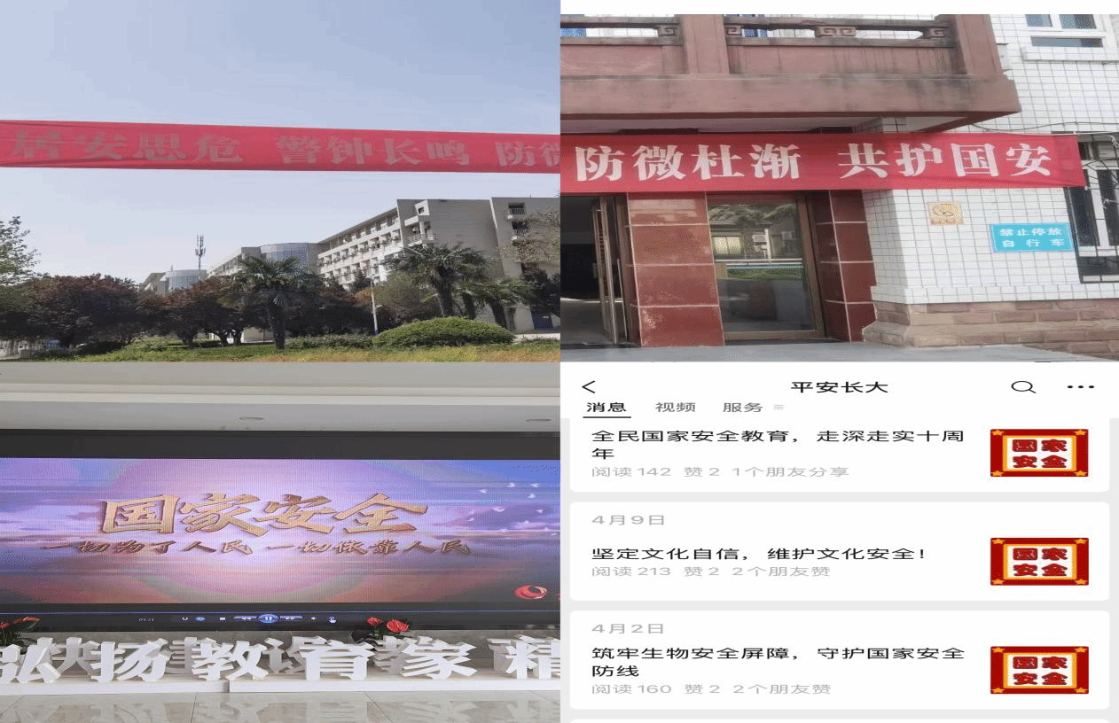 自宣教活动启动以来,学校通过线上线下相结合的方式在校内开展国家安全宣传教育,在校园主干道悬挂国家安全宣传横幅;利用校园LED电子屏播放4·15国家安全教育日宣传视频,滚动播放国家安全相关知识点;充分利用微信公众平台,全方位、多角度科普宣传国家安全教育相关内容,做好“4·15”系列宣传教育推送。
