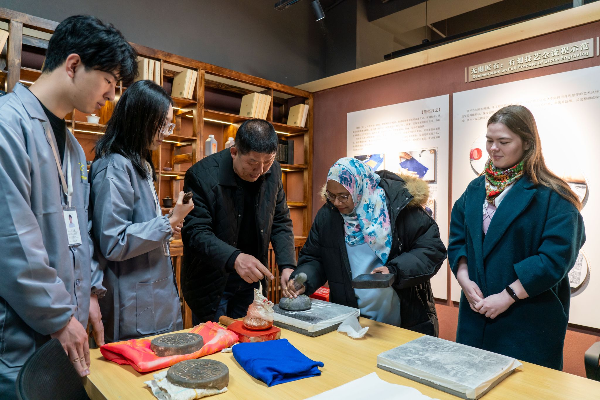 仪式结束后,嘉宾和师生们在学生讲解员的引导下,一同参观了石刻艺术馆。现场还开展了拓片、刻字等学生实践活动,学生们现场体验了传统碑刻的艺术魅力。