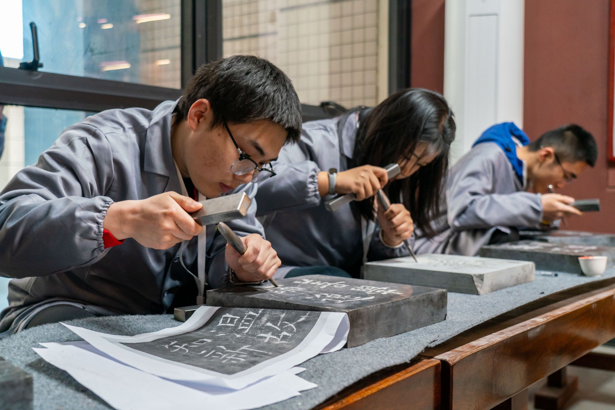 学生现场体验刻字、拓片