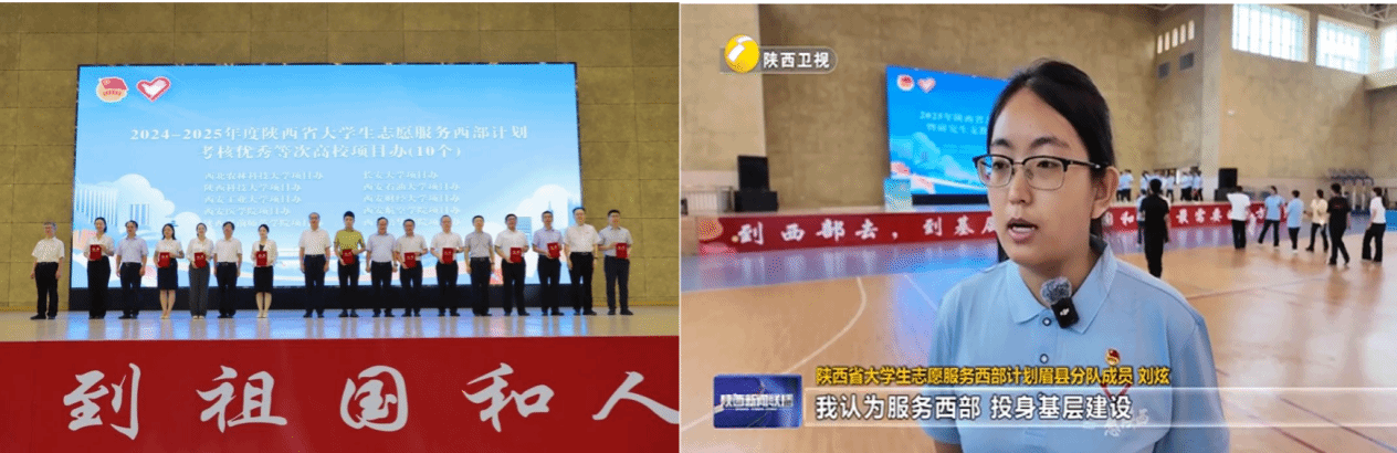 近日,2025年陕西省大学生志愿服务西部计划志愿者出征仪式举行。共青团陕西省委书记徐永胜,省教育厅、省财政厅、省人社厅等部门相关领导出席活动,与会领导为2024-2025年度陕西省大学生志愿服务西部计划考核鉴定优秀等次集体(个人)颁发证书。环球ug登录网站西部计划项目办荣获“2024-2025年度陕西省大学生志愿服务西部计划考核优秀等次项目办”,第十三届研究生支教团成员聂浩然、董芳琪、韩硕等3名志愿者荣获“2024-2025年度全国和陕西省大学生志愿服务西部计划考核优秀等次志愿者”。活动结束后,环球ug登录网站2025-2026年度西部计划志愿者代表、经济与管理学院2025届本科生刘炫代表西部计划志愿者接受了陕西广播电视台采访。