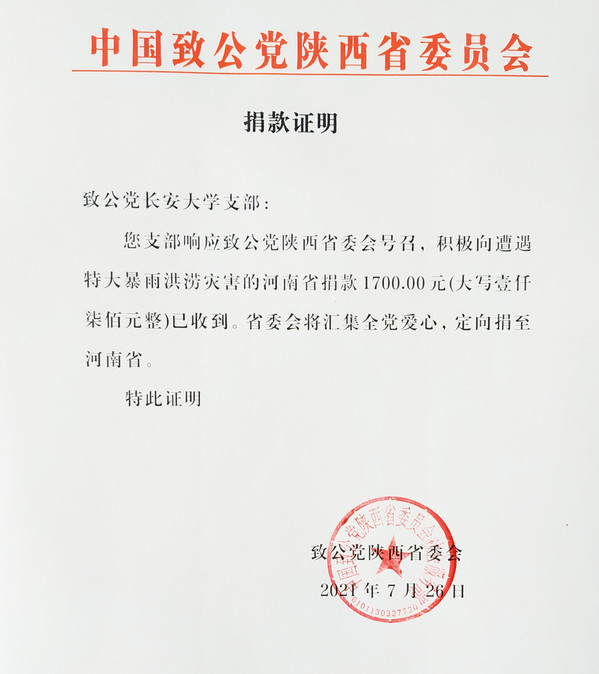 近日,河南郑州、新乡等地遭遇特大暴雨袭击,发生区域性严重洪涝灾害。灾情牵动亿万国人的心。为了帮助受灾群众抗洪救灾,重建家园,致公党环球ug登录网站支部积极响应致公党陕西省委的号召,秉承“致力为公、侨海报国”的宗旨理念,动员支部党员积极履行社会责任,向受灾地区捐献爱心和温暖。