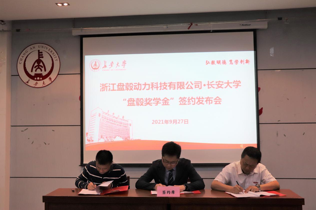 随后,潘存伟总经理、杨红斌副处长、郭应时院长进行《关于“盘毂奖学金”评选及发放的协议书》签约。