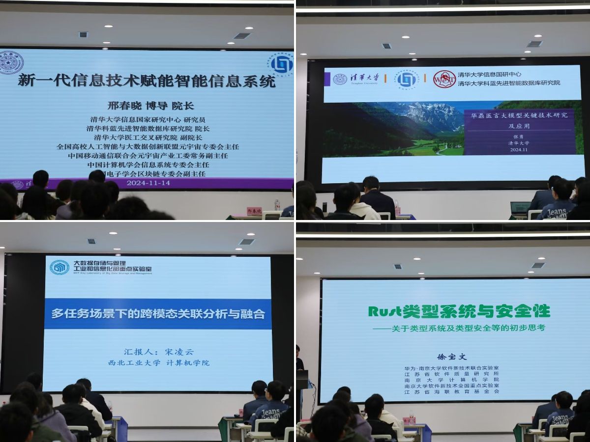邢春晓教授以“新一代信息技术赋能智能信息系统”为题,讨论了人工智能、大数据、区块链等技术在现代社会中的应用和发展,以及它们对未来社会的影响。张勇教授以“华鼎医言大模型关键技术研究及应用”为题,介绍了华鼎医言大模型是由先进的智能数据库研究院开发的一个项目,旨在国产化和打造全员型分布数据库,专注于人工智能、区块链、大数据管理和人工智能技术的应用研究。宋凌云教授以“多任务场景下的跨模态关联分析与融合”为题,介绍了多模态大模型在人工智能领域的研究背景、挑战和进展,他指出,人类通过多种方式获取知识、感知环境并进行理解与推理,这一认知方式启发了多模态AI的发展,如GPT和BERT等模型。徐宝文教授以“Rust类型系统与安全性——关于类型系统及类型安全等的初步思考”为题,指出Rust语言作为系统级编程领域的新星,以其卓越的性能和安全性受到广泛关注。