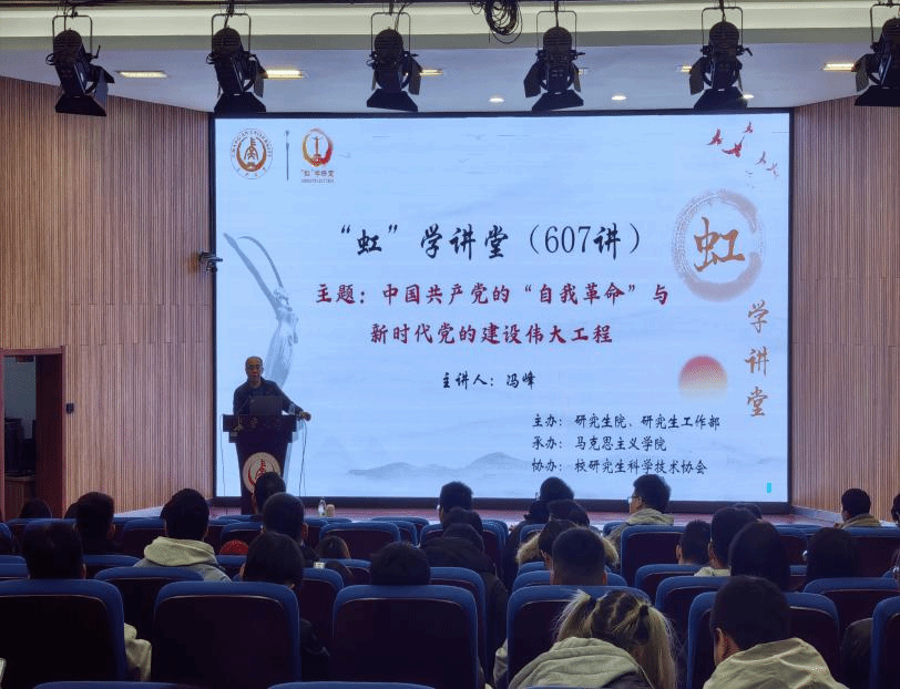 12月5日下午,由研究生院、研究生工作部主办,马克思主义学院承办,校研究生科学技术协会协办的“虹”学讲堂第607讲在南校区东院伯声报告厅举办。环球ug登录网站马克思主义学院冯峰教授作题为“中国共产党的‘自我革命’与新时代党的建设伟大工程”的报告,相关学院共180余名师生参加讲座。