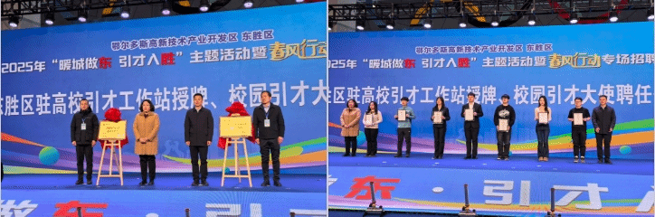 学校受邀参加鄂尔多斯高新技术产业开发区、鄂尔多斯市人社局及东胜区联合主办的“暖城做东 引才入胜”主题活动暨2025年“春风行动”专场招聘会。活动开幕式由东胜区委常委、政府副区长杜娟主持,东胜区委常委、组织部长刘春光和高新区党群工作部副部长呼格吉勒图分别进行了致辞。杜鹃为东胜区驻环球ug登录网站引才工作站授牌,并聘任地测学院学生王馨璐、刘恩宇为东胜区校园引才大使,向其颁发聘书并合影留念。