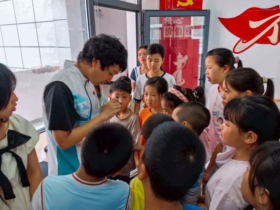 实践队设计了语文、数学和英语等基础知识特色课程。李乐平通过“句型投篮”游戏强化了同学们对英语句型的理解;刘梦莎以“数形结合”方法教会同学们破解数学难题;申航行通过《一个苹果》革命故事激发了同学们的爱国热情。针对高年级学生,实践队提供了一对一课业辅导,受到了当地学生及居民的一致好评。