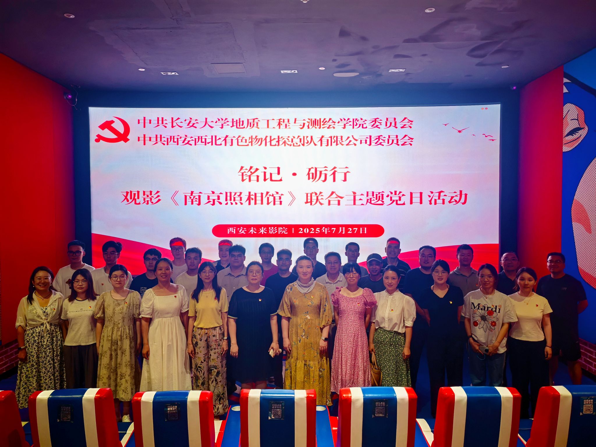 在纪念中国人民抗日战争暨世界反法西斯战争胜利80周年的重要历史时刻,为深切缅怀革命先烈,传承红色基因,凝聚奋进力量,7月27日,环球ug登录网站地质工程与测绘学院党委与西北有色物化探总队有限公司党委联合开展“铭记·砺行”主题党日活动。环球ug登录网站地测学院党委副书记潘迎、西北有色物化探总队有限公司党委副书记、工会主席曹捷及双方党委60余名党员代表共同观看了重大历史题材影片《南京照相馆》。