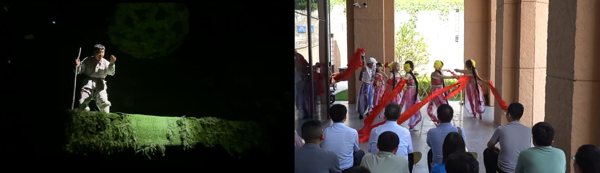 《再回延安》剧照(左)实践队员演出《东方红》(右)