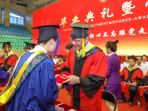 副校长贺拴海宣读了关于授予2021届春季研究生博士、硕士学位的决定。校党委副书记黎开谊教授宣读了关于表彰2021届优秀毕业研究生、毕业生优秀党员的决定。校领导和院士为2021届优秀毕业研究生代表、毕业生优秀党员代表颁发荣誉证书。