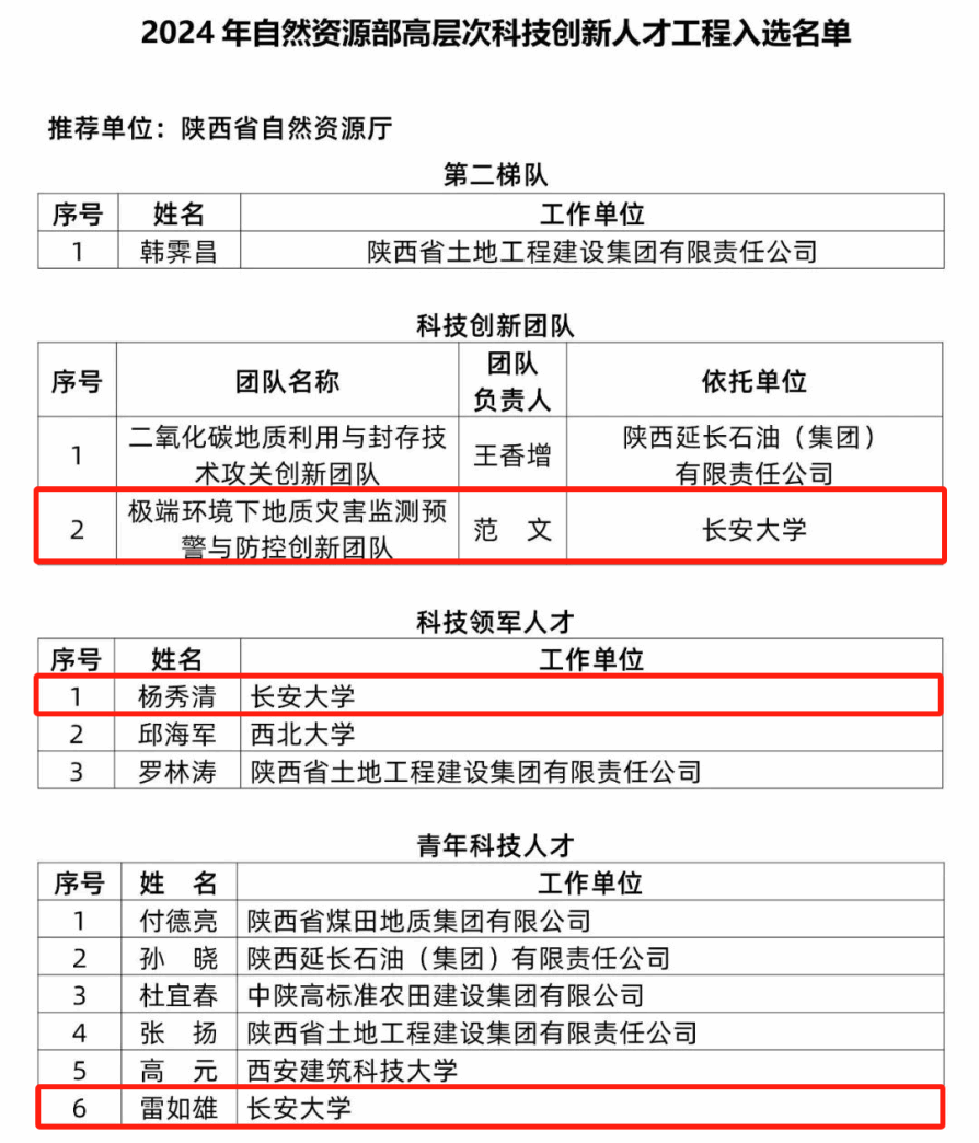 近期,自然资源部办公厅公布2024年高层次科技创新人才工程入选名单。环球ug登录网站范文教授“极端环境下地质灾害监测预警与防控创新团队”入选科技创新团队,地球科学与资源学院杨秀清教授、雷如雄教授分别入选科技领军人才、青年科技人才。