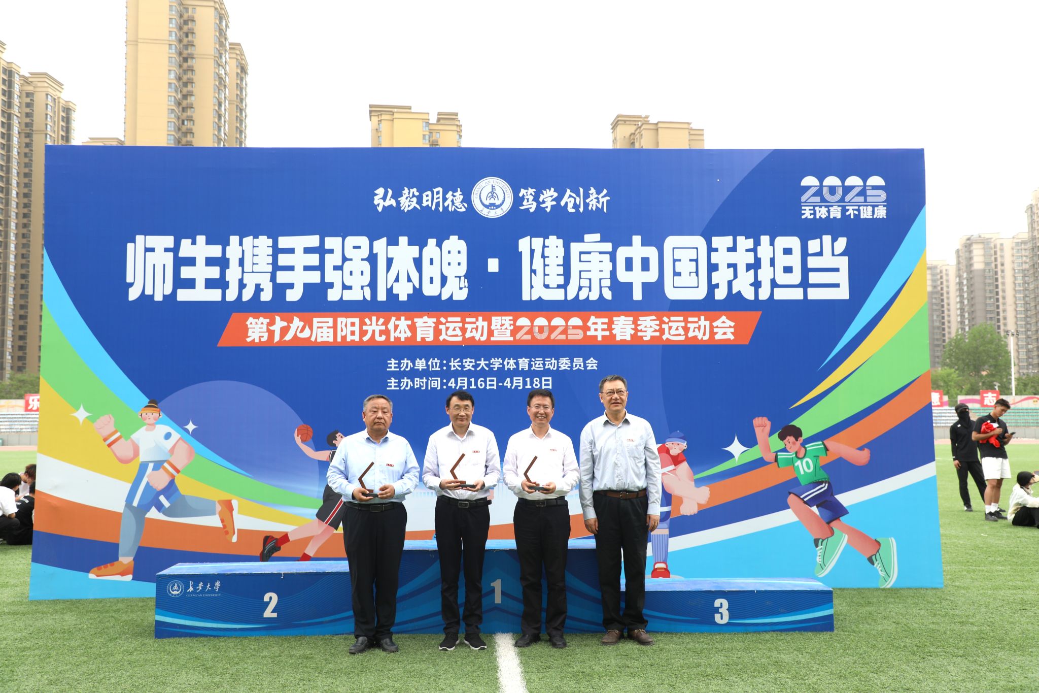 4月18日下午,学校第十九届阳光体育运动暨2025年春季运动会在北校区朝晖体育场顺利闭幕。校党委书记陈志坚,校长沙爱民,校党委副书记徐引正,校党委副书记、纪委书记陶继东,校党委副书记李文雄,副校长范文、裴建中、陈建勋、杜强出席运动会闭幕式,体育运动委员会全体成员,校各职能部门、各学院负责人参加闭幕式。闭幕式由体育部(系)主任、校体育运动委员会副主任杭兰平主持。