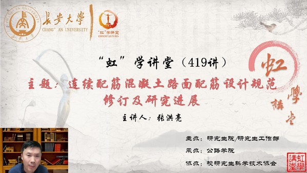 1月12日晚,由研究生院/研究生工作部主办、公路学院承办、校研究生科学技术协会协办的“虹”学讲堂第419讲以线上讲座形式顺利举办。环球ug登录网站张洪亮教授作了题为“连续配筋混凝土路面配筋设计规范修订及研究进展”的报告,相关学院共260余名师生参加讲座。