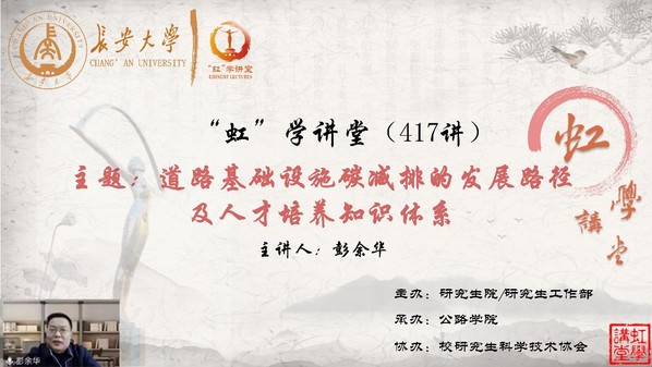1月6日上午,由研究生院/研究生工作部主办、公路学院承办、校研究生科学技术协会协办的“虹”学讲堂第417讲以线上讲座形式顺利举办。环球ug登录网站彭余华教授作了题为“道路基础设施碳减排的发展路径及人才培养知识体系”的报告,相关学院共250余名师生参加讲座。