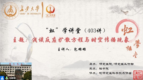 11月24日晚,由研究生院/研究生工作部主办、理学院承办、校研究生科学技术协会协办的“虹”学讲堂第403讲以线上讲座形式顺利举办。环球ug登录网站包雄雄教授作了题为“浅谈反应扩散方程与时空传播现象”的报告,理学院党委副书记屈颖主持,相关学院共340余名师生参加讲座。
