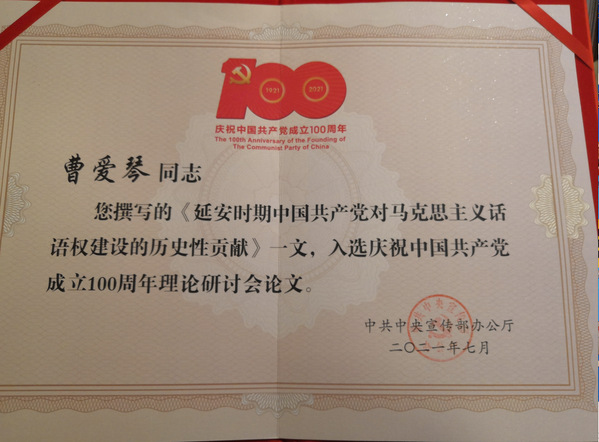 这次理论研讨会,是中国共产党成立100周年庆祝活动的一项重要内容。年初,教育部办公厅面向部属各高等学校发布征稿通知,环球ug登录网站社科处认真组织动员,择优推荐了曹爱琴副教授撰写的《延安时期中国共产党对马克思主义话语权建设的历史性贡献》一文。经教育部评审,该文作为从200多篇征稿中脱颖而出的8篇论文之一,被教育部推荐入选《庆祝中国共产党成立100周年理论研讨会论文集》(学习出版社出版)。