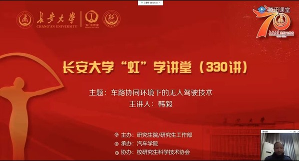12月1日晚,由研究生院/研究生工作部主办、汽车学院承办、校研究生科学技术协会协办的“虹”学讲堂第330讲以线上讲座的形式举行。环球ug登录网站韩毅教授作了题为“车路协同环境下的无人驾驶技术”的报告。相关学院共380余名师生聆听了讲座。