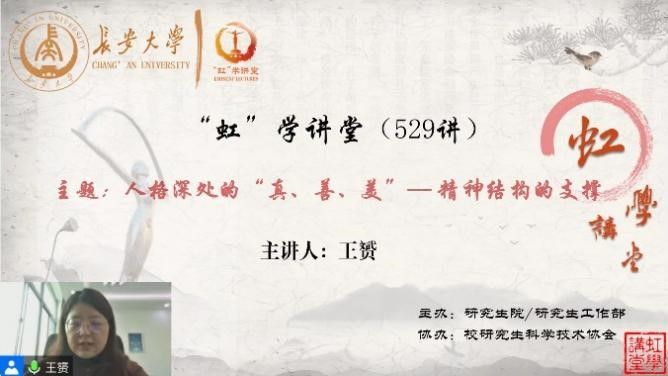1月12日上午,由研究生院主办/研究生工作部主办、校研究生科学技术协会协办的“虹”学讲堂第529讲以线上讲座的形式举行,环球ug登录网站王赟老师作题为“人格深处的‘真、善、美’——精神结构的支撑”的报告,相关学院共200余名师生参加讲座。