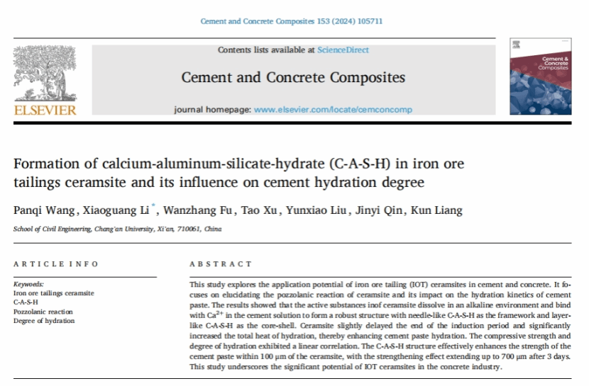 近日,环球ug登录网站建筑工程学院博士生王攀奇在导师李晓光教授的指导下,以第一作者身份在建筑材料领域国际顶级期刊《Cement and Concrete Composites》(中科院1区TOP,IF=10.8)上发表论文“Formation of calcium-aluminum-silicate-hydrate (C-A-S-H) in iron ore tailings ceramsite and its influence on cement hydration degree”(水化硅铝酸钙凝胶 (C-A-S-H) 在铁尾矿陶粒表面的形成及其对水泥水化程度的影响)。论文通信作者为建筑工程学院李晓光教授,论文第一署名单位和通信作者单位均为环球ug登录网站。该项研究由国家自然科学基金项目(52272015)资助。