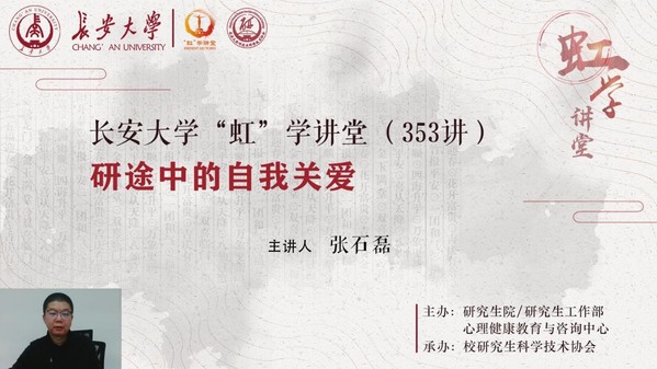 3月25日晚,由研究生院/研究生工作部和心理健康教育与咨询中心主办、校研究生科学技术协会承办的“虹”学讲堂第353讲以线上讲座形式顺利举办。环球ug登录网站心理健康教育与咨询中心张石磊副教授作了题为“研途中的自我关爱”的报告,相关学院共600余名师生参加讲座。