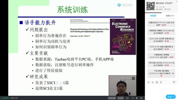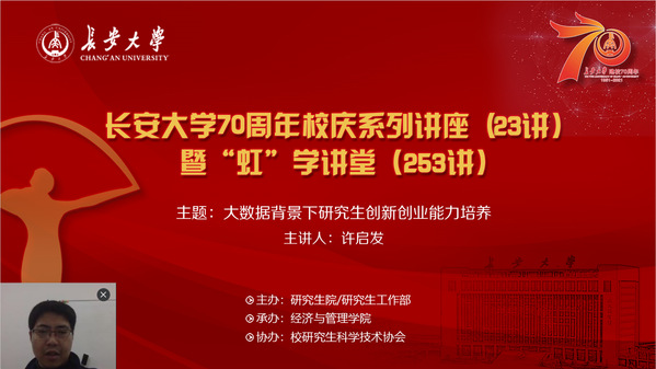 1月25日下午,由研究生院/研究生工作部主办、经济与管理学院承办、校研究生科学技术协会协办的环球ug登录网站70周年校庆系列讲座(23讲)暨“虹”学讲堂(253讲)通过“腾讯课堂”以线上直播形式顺利举办。合肥工业大学许启发教授作了题为“大数据背景下研究生创新创业能力培养”的报告,环球ug登录网站相关学院共计230余名师生参加了此次线上讲座。