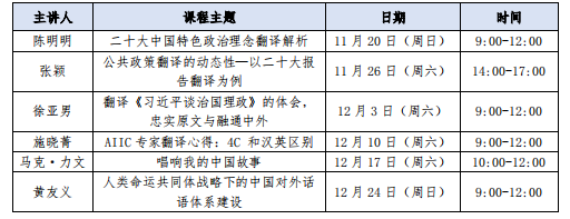 本次“翻译中国与大国形象”主题教育研究包括课程学习和教学研讨两部分,课程学习以“新时代背景下‘翻译中国’时政类话语体系外语专业技术人才专题培训班”线上授课为主,从11月20日-12月24日共6个周日分6次进行,教学研讨活动将于课程学习结束后线下举行。