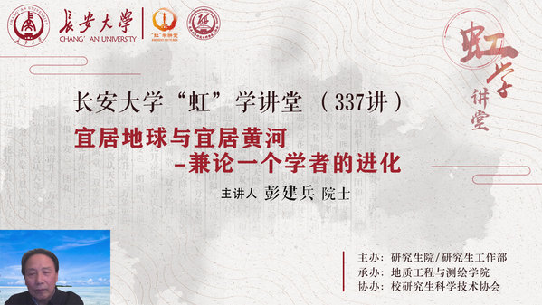 为深入贯彻习近平总书记关于加强疫情防控的重要指示精神,全面落实中央、省、市、区部署要求,帮助广大师生平稳充实地渡过特殊时期,充实丰富封闭期间的科研学习生活,1月1日上午,由研究生院/研究生工作部主办、地质工程与测绘学院承办、校研究生科学技术协会协办的“虹”学讲堂第337讲以线上讲座形式顺利举办。彭建兵院士应邀为环球ug登录网站师生作了题为《宜居地球与宜居黄河——兼论一个学者的进化》的学术报告。地测学院党政领导、兄弟院校的学者及来自各学院的1220余名师生聆听报告。报告会由地测学院院长李振洪主持。