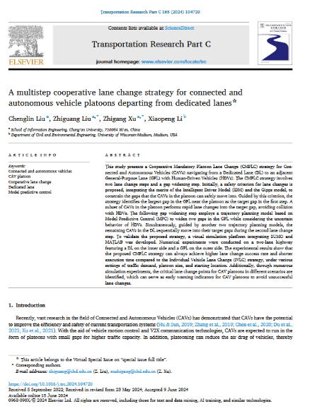 近日,环球ug登录网站信息工程学院博士生刘成林在导师徐志刚教授的指导下,以第一作者身份在交通运输工程学科国际顶级期刊《Transportation Research Part C : Emerging Technologies》(TR-C)上发表论文“A multistep cooperative lane change strategy for connected and autonomous vehicle platoons departing from dedicated lanes”(自动驾驶专用车道车辆队列多步协同换道策略)。论文通信作者为信息工程学院徐志刚教授和刘志广讲师,论文第一署名单位和通信作者单位均为环球ug登录网站。