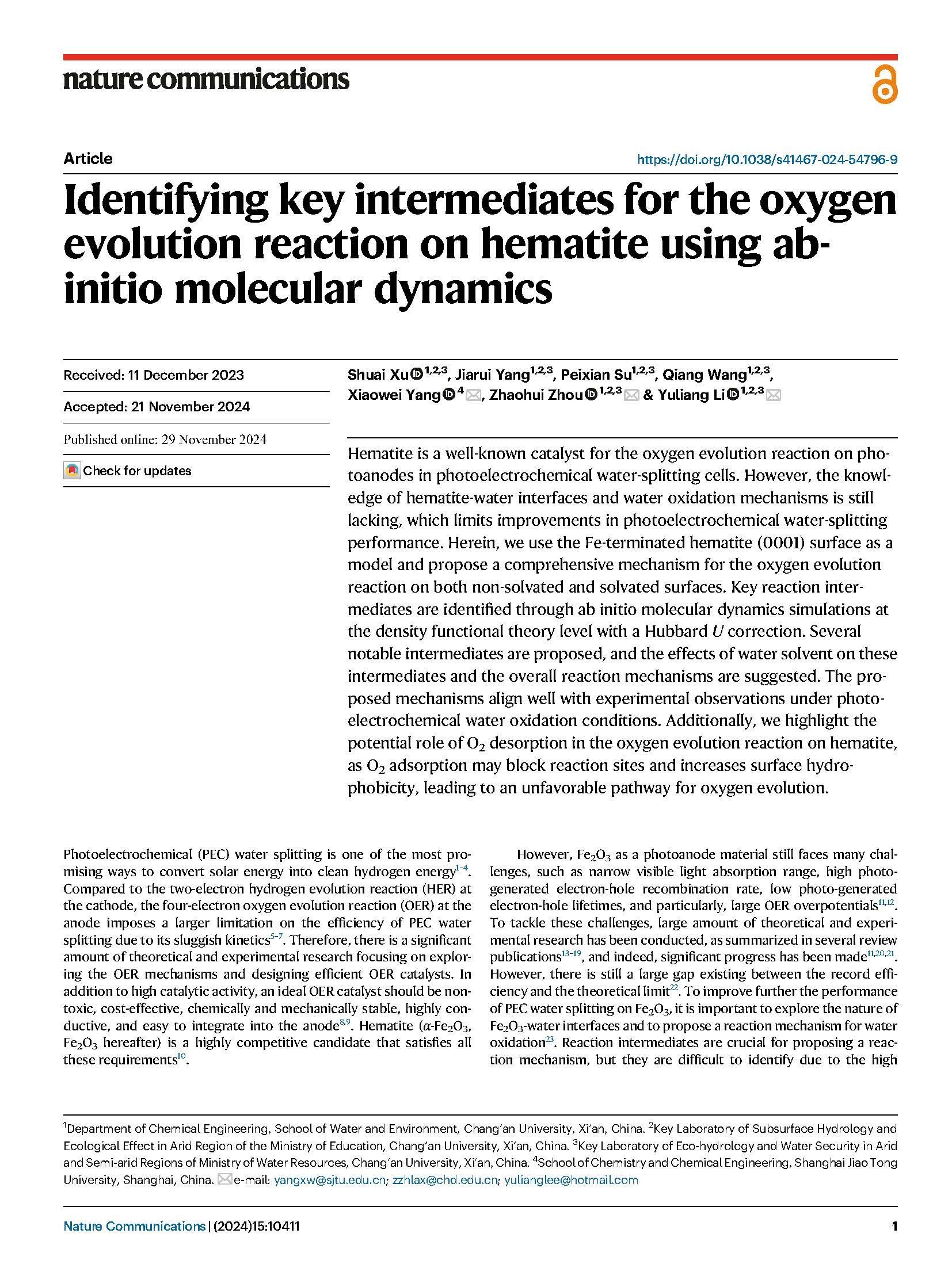 11 月 29 日,环球ug登录网站水利与环境学院李宇亮教授/周朝晖副教授在《自然》(《Nature》)杂志子刊《自然·通讯》(Nature Communications)在线发表了题为“Identifying key intermediates for the oxygen evolution reaction on hematite using ab-initio molecular dynamics”的研究论文(Article)。环球ug登录网站为第一署名单位和第一通讯单位。第一作者为环球ug登录网站博士研究生徐帅,李宇亮/周朝晖和上海交通大学杨晓伟教授作为共同通讯作者。