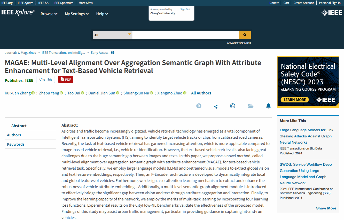 近日,环球ug登录网站未来交通学院智慧城市智能交通团队在交通运输领域国际顶级期刊《IEEE Transactions on Intelligent Transportation Systems》(T-ITS)上发表题为《MAGAE: Multi-level Alignment over Aggregation Semantic Graph with Attribute Enhancement for Text-based Vehicle Retrieval》的研究成果。未来交通学院2021级本科生张瑞轩、杨喆普分别为论文第一和第二作者,戴涛副教授为通讯作者,环球ug登录网站为第一署名单位和第一通讯单位。这是环球ug登录网站近年首次由本科生为第一作者在该行业顶级期刊发表论文。