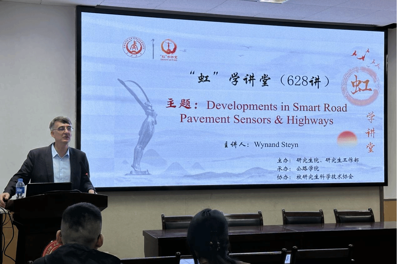 4月14日下午,由研究生院、研究生工作部主办,公路学院承办,校研究生科学技术协会协办的“虹”学讲堂第628讲在南校区北院交通科技大厦602会议室举办。南非比勒陀利亚大学Wynand Steyn教授应邀作了题为“Developments in Smart Road Pavement Sensors & Highways”的报告。会议由环球ug登录网站公路学院马峰教授主持,相关学院共120余名师生参加讲座。