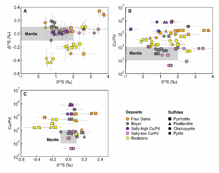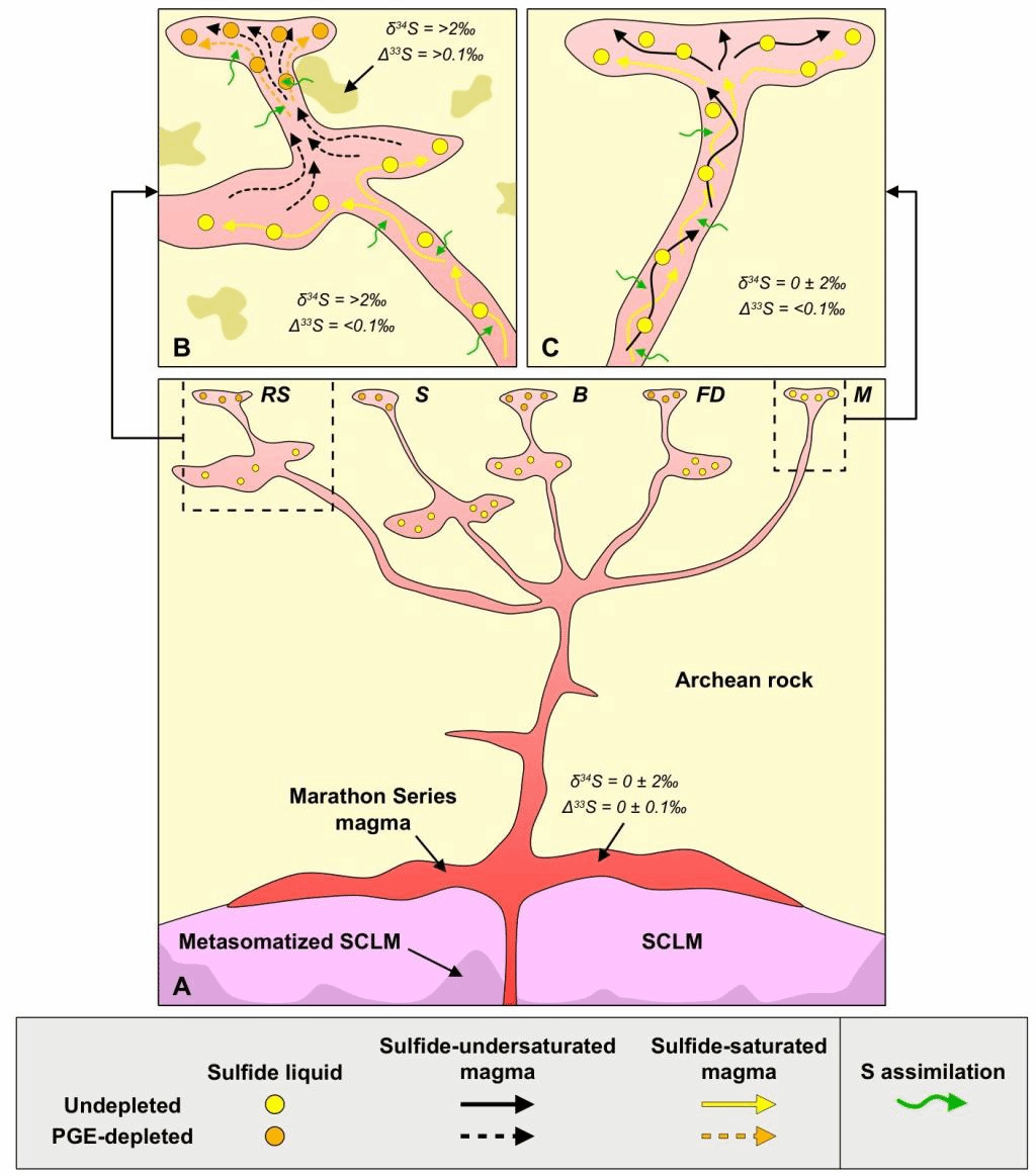 针对这些科学问题,马修教授领衔的国际铜镍硫化物矿床研究团队通过分析北美最大的Coldwell碱性杂岩体东部辉长岩套(图1)中Cu-Ni-PGE 矿床群的硫同位素组成(δ³⁴S和Δ³³S)以及全岩Cu/Pd比值,发现(图2):北部矿床的δ³⁴S值(-0.7‰至3.78‰)和Δ³³S值(-0.44‰至0.34‰)显著偏离地幔范围(δ³⁴S=0±2‰,Δ³³S=0±0.1‰)。据此,研究团队提出,(1)北部矿床群中的硫有约20%来自太古代地壳,硫化物经过多期次分离与PGE(铂族元素)动态再富集;(2)东部Marathon 矿床硫源均来自地幔,深部没有出现硫化物熔离,岩浆快速上升导致地壳混染极弱(图3)。本次研究为岩浆通道型矿床中硫同位素的分馏机制及PGE成矿动力学提供了新视角。